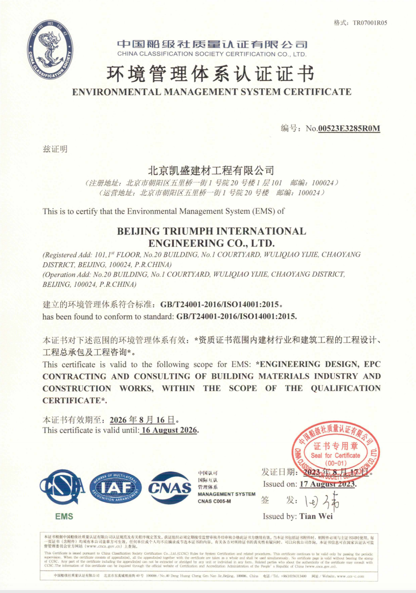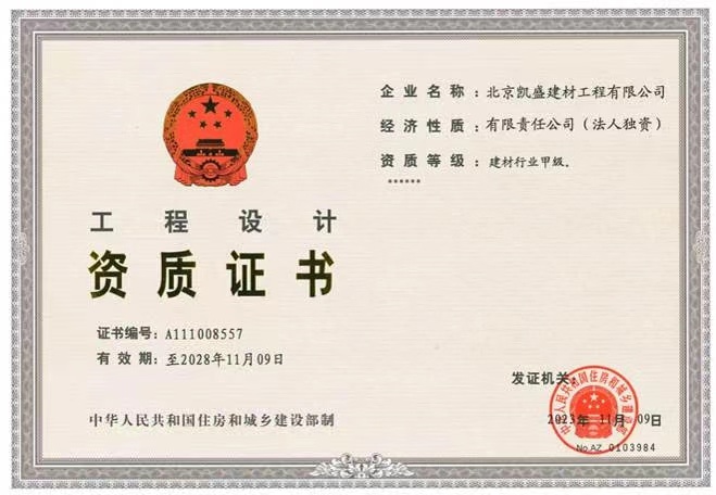 北京凱盛擁有國家建材行業(yè)工程咨詢甲級資信證書、建材行業(yè)甲級工程設(shè)計資質(zhì)證書、冶金工程施工總承包一級資質(zhì)證書,是國家級高新技術(shù)企業(yè)。